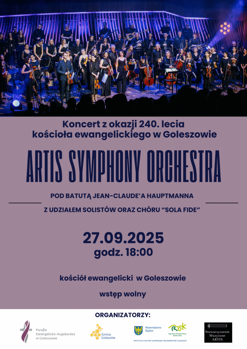 Zaproszenie na koncert Artis Symphony Orchestra z okazji 240. lat kościoła ewangelickiego w Goleszowie